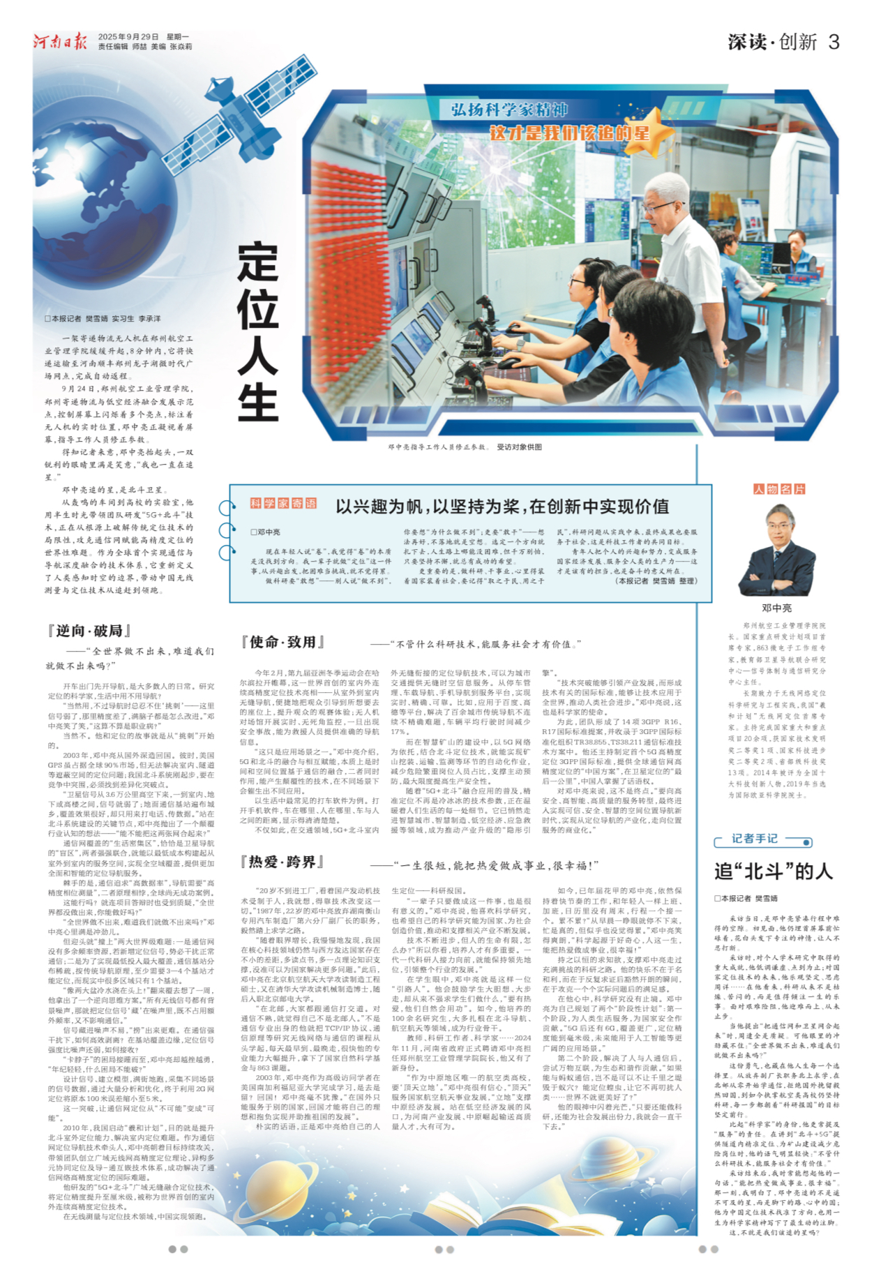 9月29日,《河南日报》第3版推出整版报道,专访校长邓中亮教授的科研事迹。邓中亮教授是国家重点研发计划项目首席专家,863微电子工作组专家,教育部卫星导航联合研究中心—信号体制与通信研究分中心主任。长期致力于无线网络定位科学研究与工程实践,是我国“羲和计划”无线网定位首席专家。主持完成国家重大和重点项目20余项,获国家技术发明奖二等奖1项、国家科技进步奖二等奖2项、省部级科技奖13项。2014年被评为全国十大科技创新人物,2019年当选为国际欧亚科学院院士。